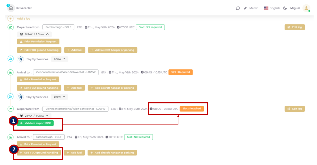 Once the flight created, the Ground handling catalogue becomes available in the flight timeline by clicking on “+ADD FBO Ground handling”, listing all the providers under this category. The access is immediate for airports not requiring slot validation 2), but requires an intermediate “Validate airport PPR” step for airports requiring arrival/departure slot validation.