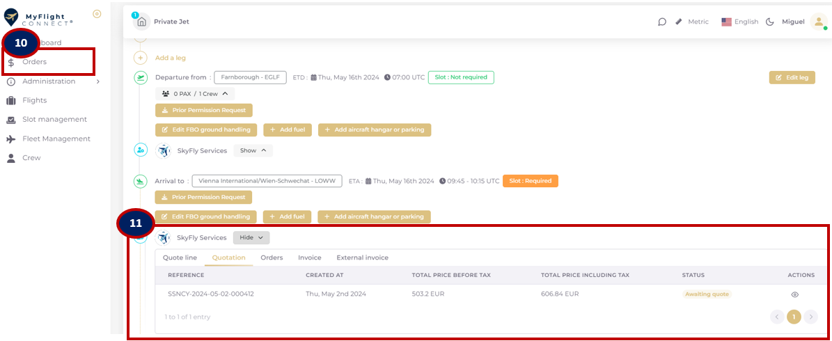 Once created, the order could be tracked in the “ORDERS DASHBOARD” 10) or in the scheduled flight timeline, accounting file 11)