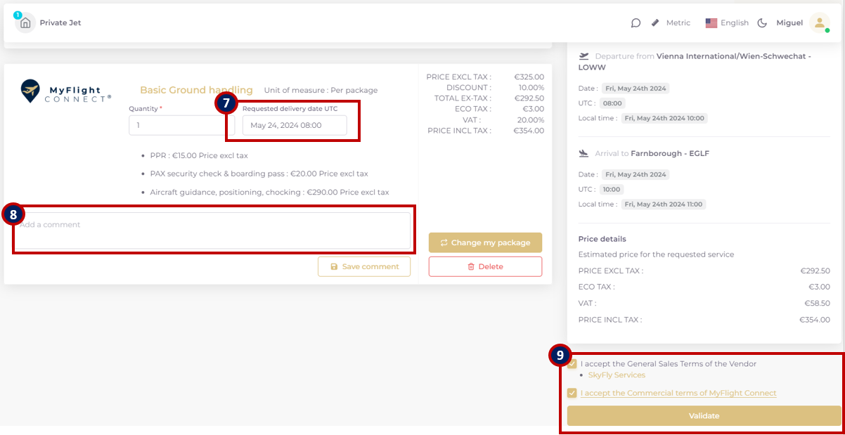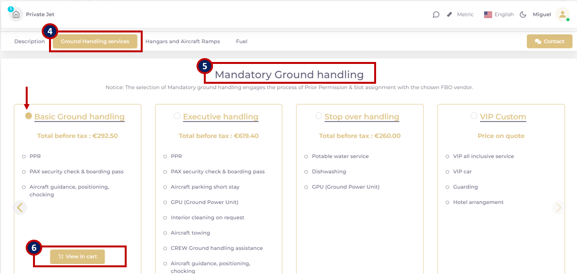 5) The mandatory Ground handling service creates the “Ground handling Request” to assign an FBO and open a slot request channel for the airports with slot authorization. “Add to cart” and “View in cart” to submit the request 6).
