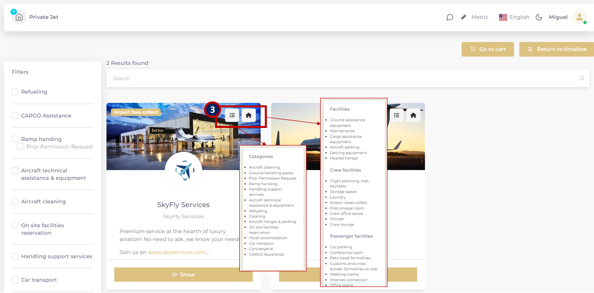 The “+Add FBO ground handling” enters the FBO and catering catalogue and lists the Service Providers in the airport of service with a high level indication of the proposed services & facilities 3).