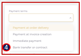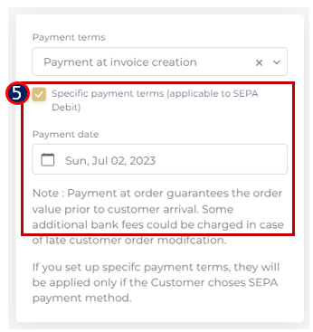 The terms “Payment at order delivery” and “Payment at invoice creation” defer the payment to mitigate bank fees application while taking a customer payment commitment for later use.