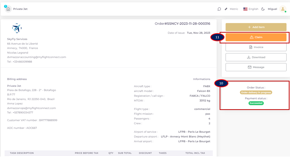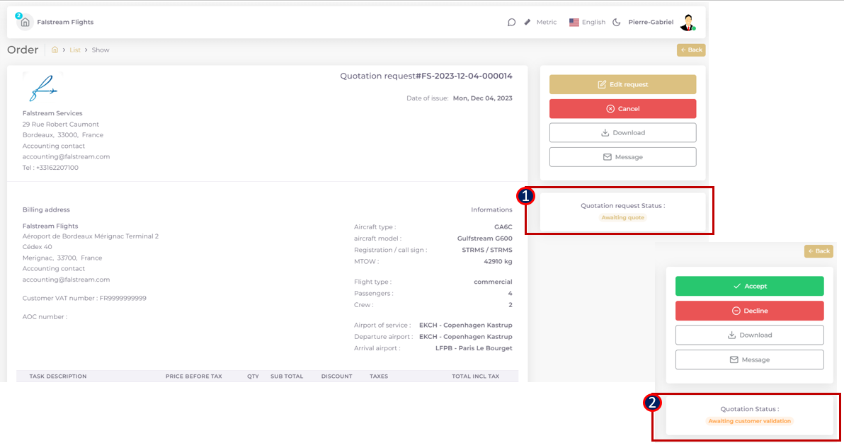 Seller initiated Quotation: the workflow starts from “Awaiting Customer Validation” order status. The Service provider prepares a “Custom Quote” from the flight accounting folder, quotation page. There must be an initial customer quote request opening the access to the flight timeline to the Service provider, to access the “ADD CUSTOM QUOTE” function.