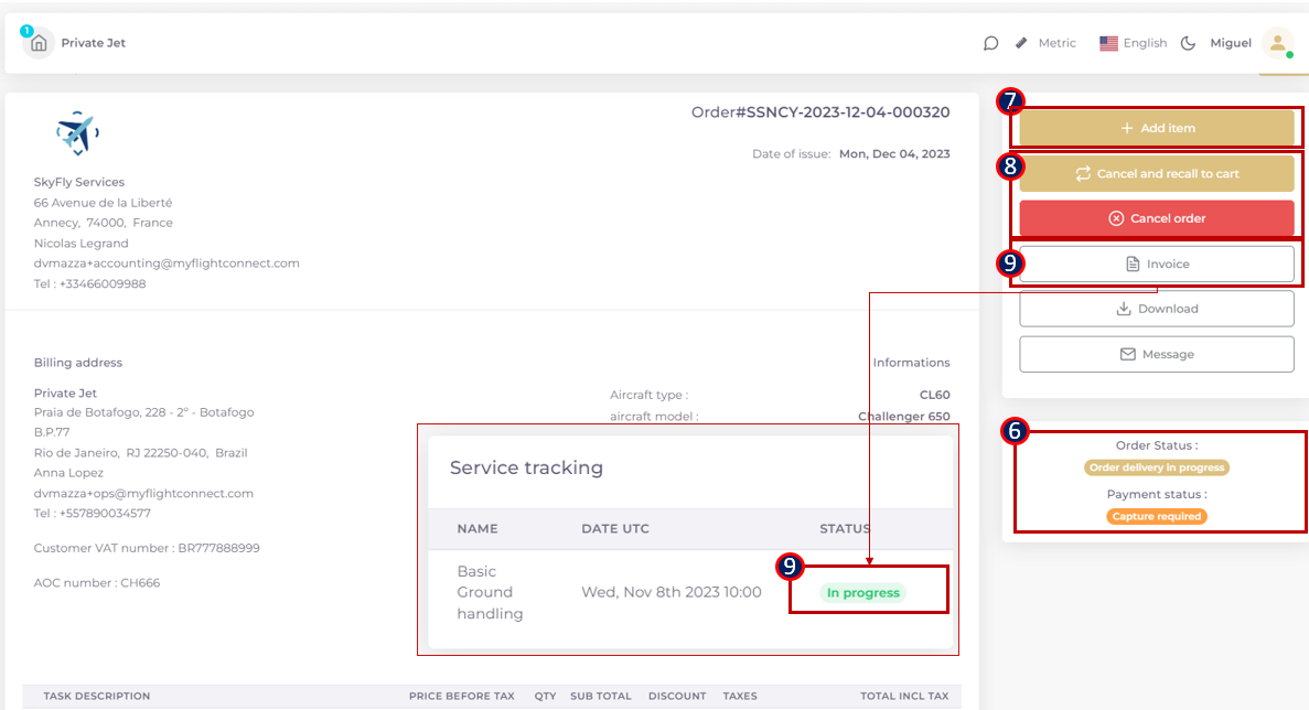 (9) The invoice generation becomes possible only if the services are at minimum “PLANNED” under “SERVICE TRACKING” in the lower part of the Ordering page.