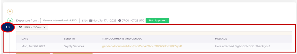 Block 13): GENDEC documents transmission channel that is opened only to the chosen FBO. The documents are temporarily stocked, until 2 days after the flight closure and automatically destroyed with respect to Privacy laws. The documents are sent in parallel by email to all authorised users. CREW members could be assigned to the flight from “Assign a crew member”