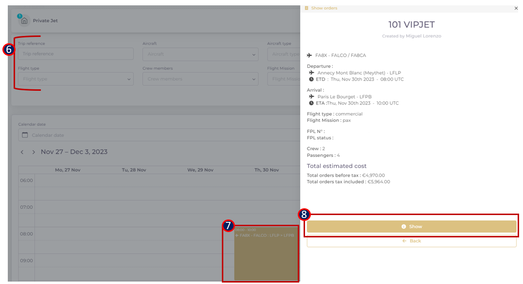 The Aircraft operator creates a trip folder for an aircraft of his fleet, containing the scheduled flight legs that will be operated under the same mission (one leg, round trip, multileg etc).