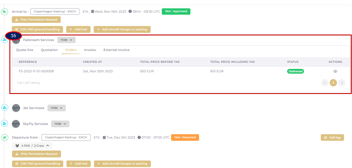 Block 16): Flight accounting folder contains all the requests for quotation, orders and invoices referenced under a flight. Each document type has his tab. When there is a schedule change, the referenced orders depend on the changing flight. Go to the following article to learn more: Flight schedule change and cancellation management