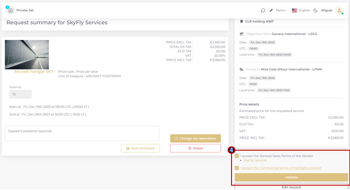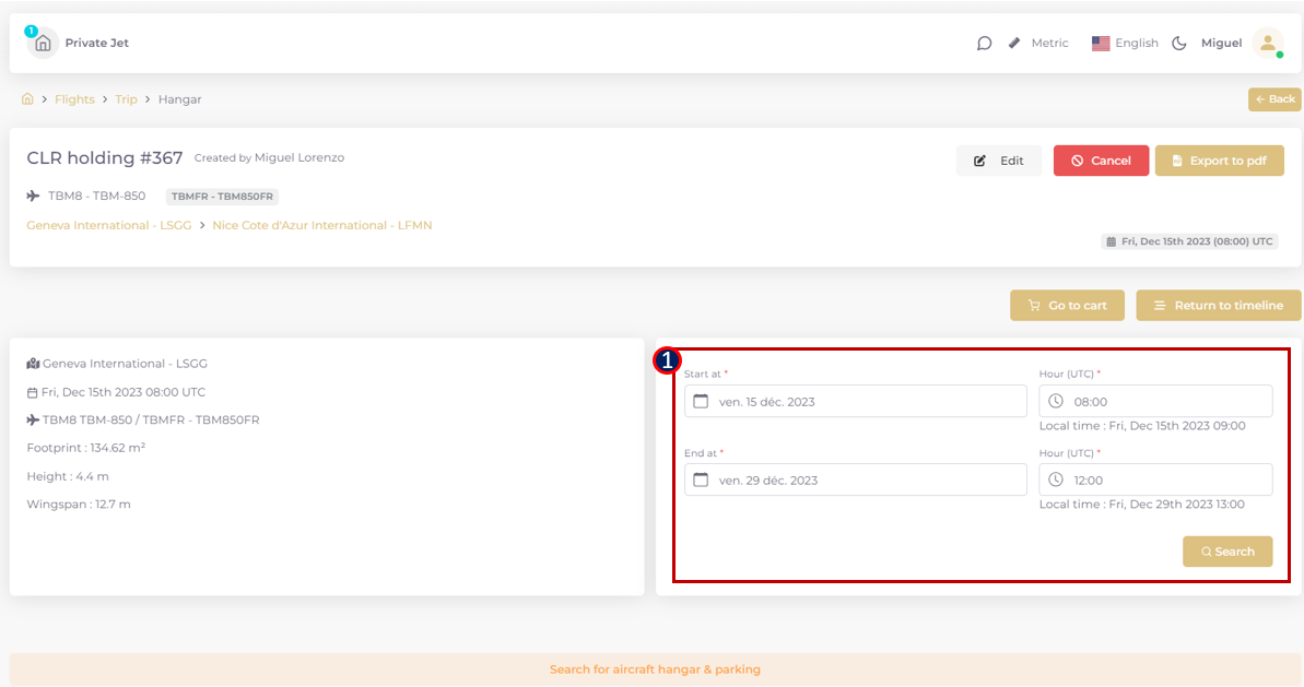 Hangar & parking catalogue search and quote request creation