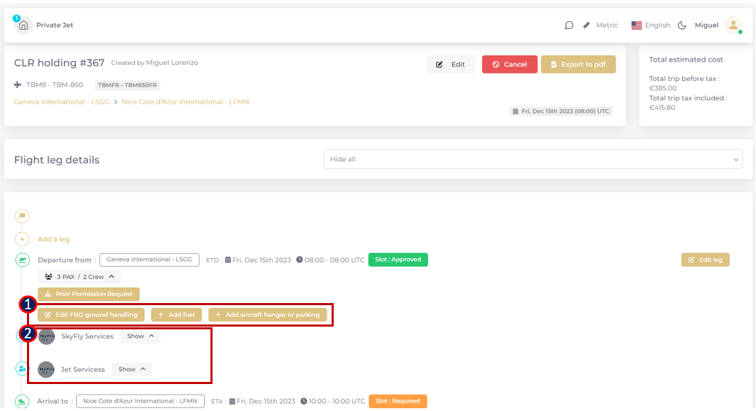 Once the flight leg successfully created and the airports requiring Slot request validated, the catalogue search becomes accessible from the trip timeline.