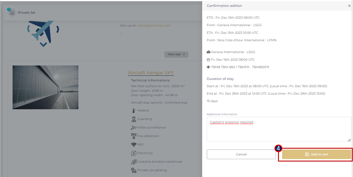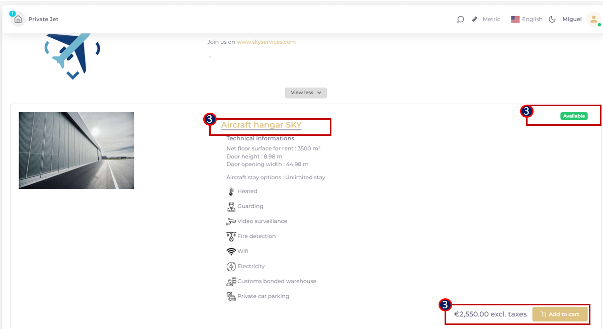 Step 3: Consult offer details and facilities description (hangar, parking, outside ramp), considering the entering aircraft profile. An estimated availability indication could be displayed. If availability indicator highlights “Availability subject to confirmation”, the Service provider should validate availability or counter prose to the customer. Ultimately, he will validate the physical availability, as movements frequently change.