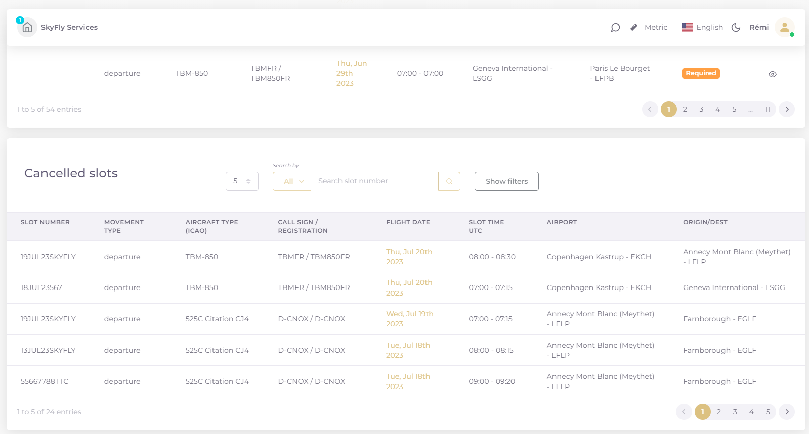 Slot date start-End UTC change by Aircraft Operator: in case of a date change, the RFQ will be maintained. The already passed orders without payment and with different status than “delivered” will be automatically cancelled. New orders have to be raised for the rescheduled flight. For already paid and delivered orders, a refund could be requested through the CLAIM PROCESS during the 7 days following the payment. The slot status will go back to “SLOT: REQUIRED” and the previously assigned slot will be cancelled (Cancelled slots dashboard). Notification email is sent to FBO to follow on slot change request.