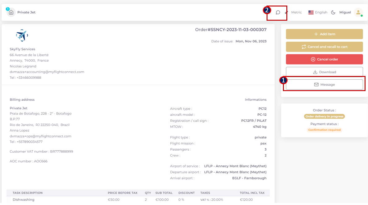 It is recommended to use the Chat channel from the request for quotation panel (1) & (2), in order to validate a suitable slot proposal. The FBO could make suggestions to the Aircraft Operator, in order to update his time schedule prior to the order submission. In case of slot unavailability, the Vendor will simply decline the handling request.