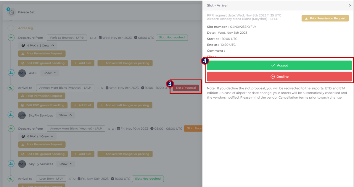 Flight schedule update following new slot proposal by FBO: there is no impact on the already passed orders if new FBO slot proposal has been accepted. The flight schedule will be updated without any consequence after the new proposal acceptance by the Aircraft Operator. An email “New slot proposal” will be automatically distributed to notify and follow the change.