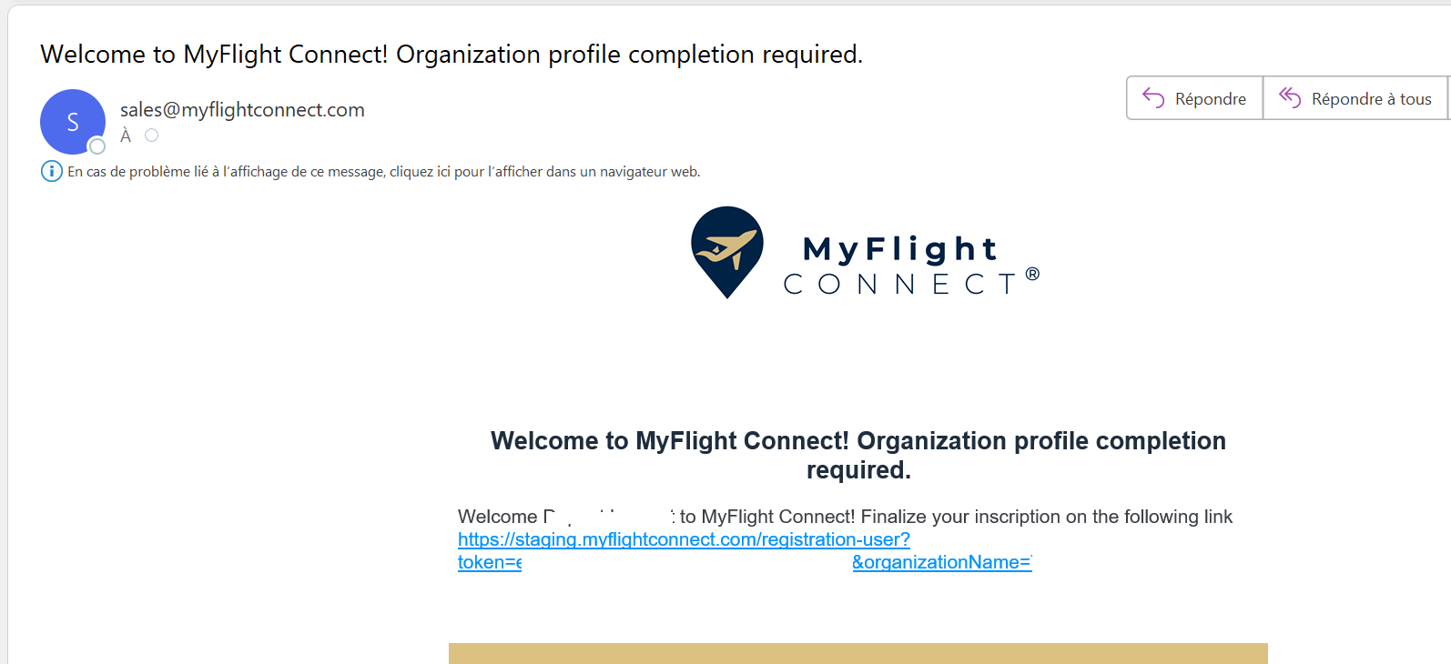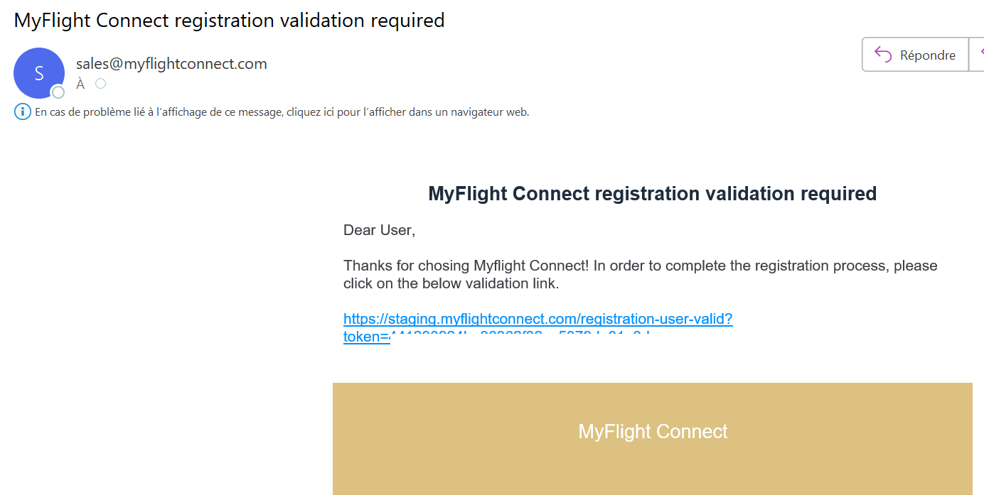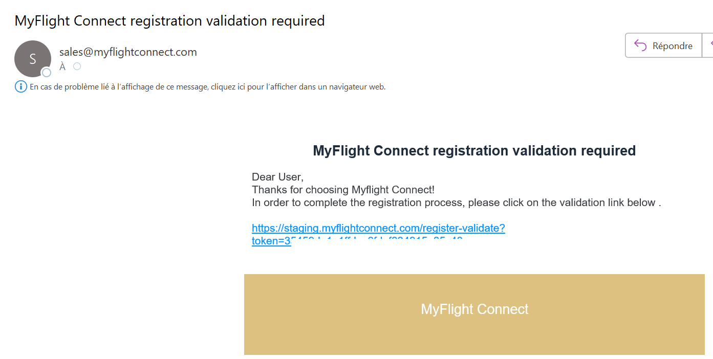 If you don’t receive this message, check your spam e-mails and flag sales@myflightconnect.com to be kept out of spam.